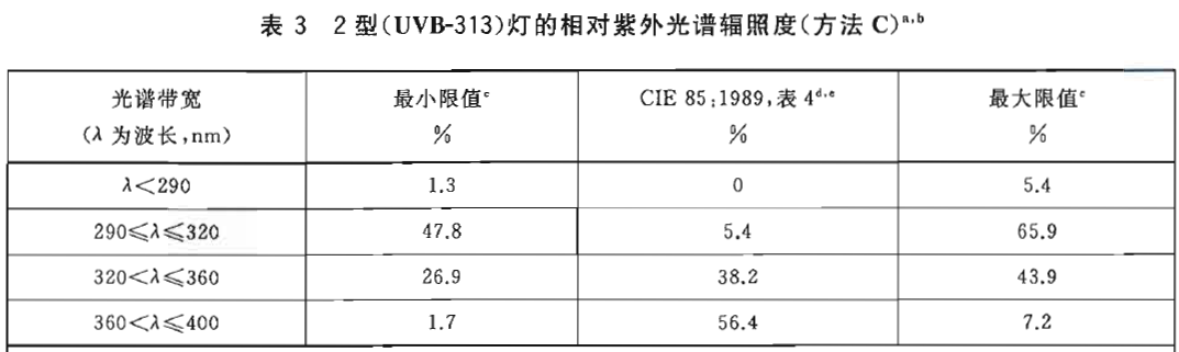 a 本表給出了在給定帶寬內(nèi)的輻照度占250nm~400nm總輻照度的百分比,要檢測(cè)一個(gè)典型的2型(UVB-313)燈是否符合本表要求,應(yīng)測(cè)量250nm~400nm的光譜輻照度。然后將每一帶寬內(nèi)的總輻照度加和,再除以250nm~400nm間的總輻照度。